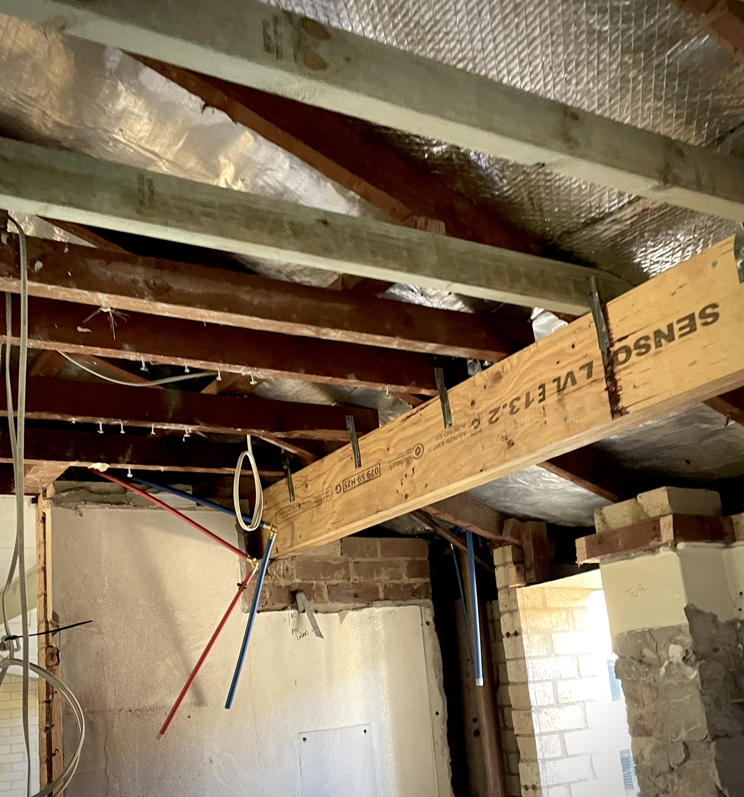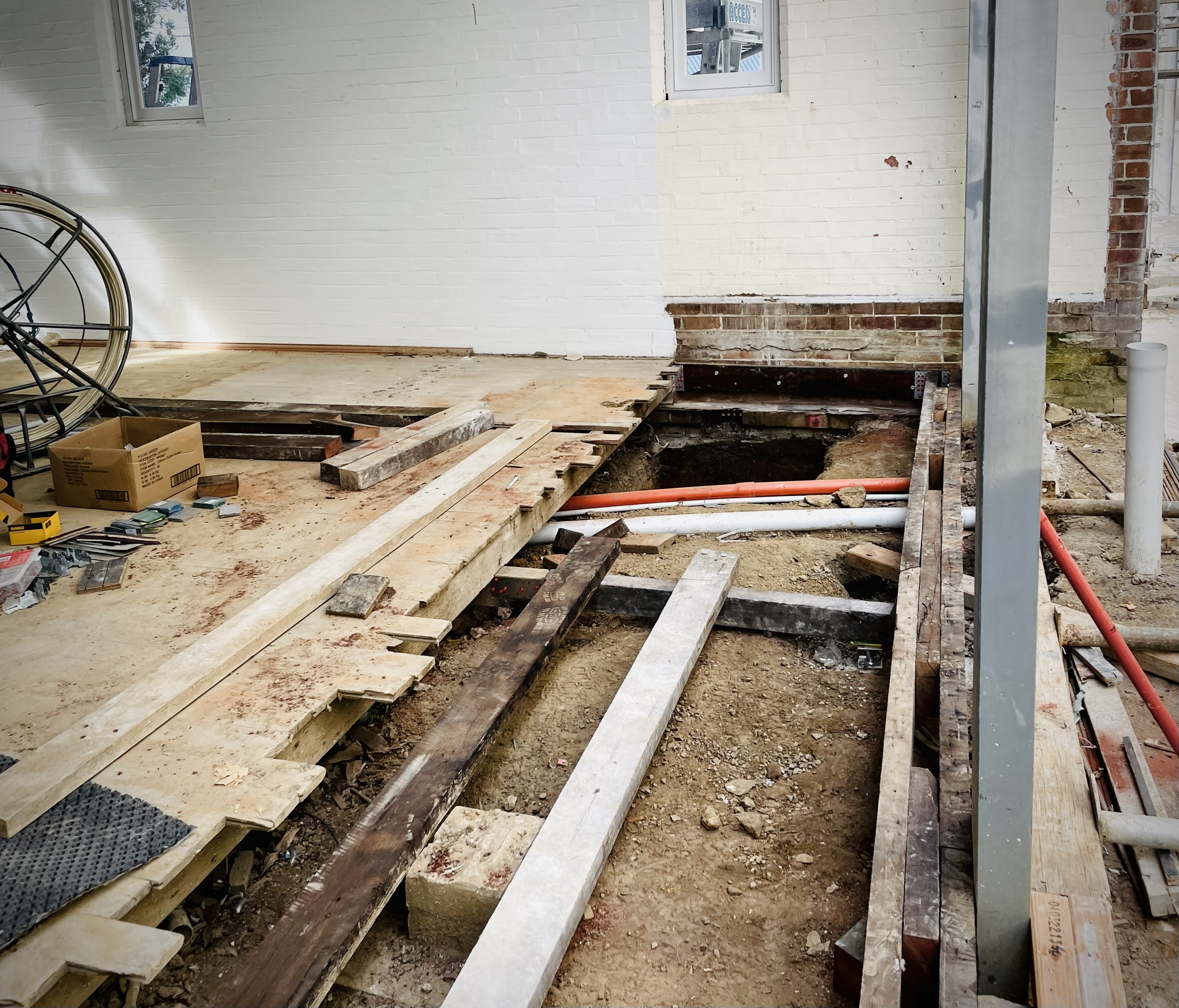 Initial progress on joists and hanging beams after termite damage was removed. North West Sydney.