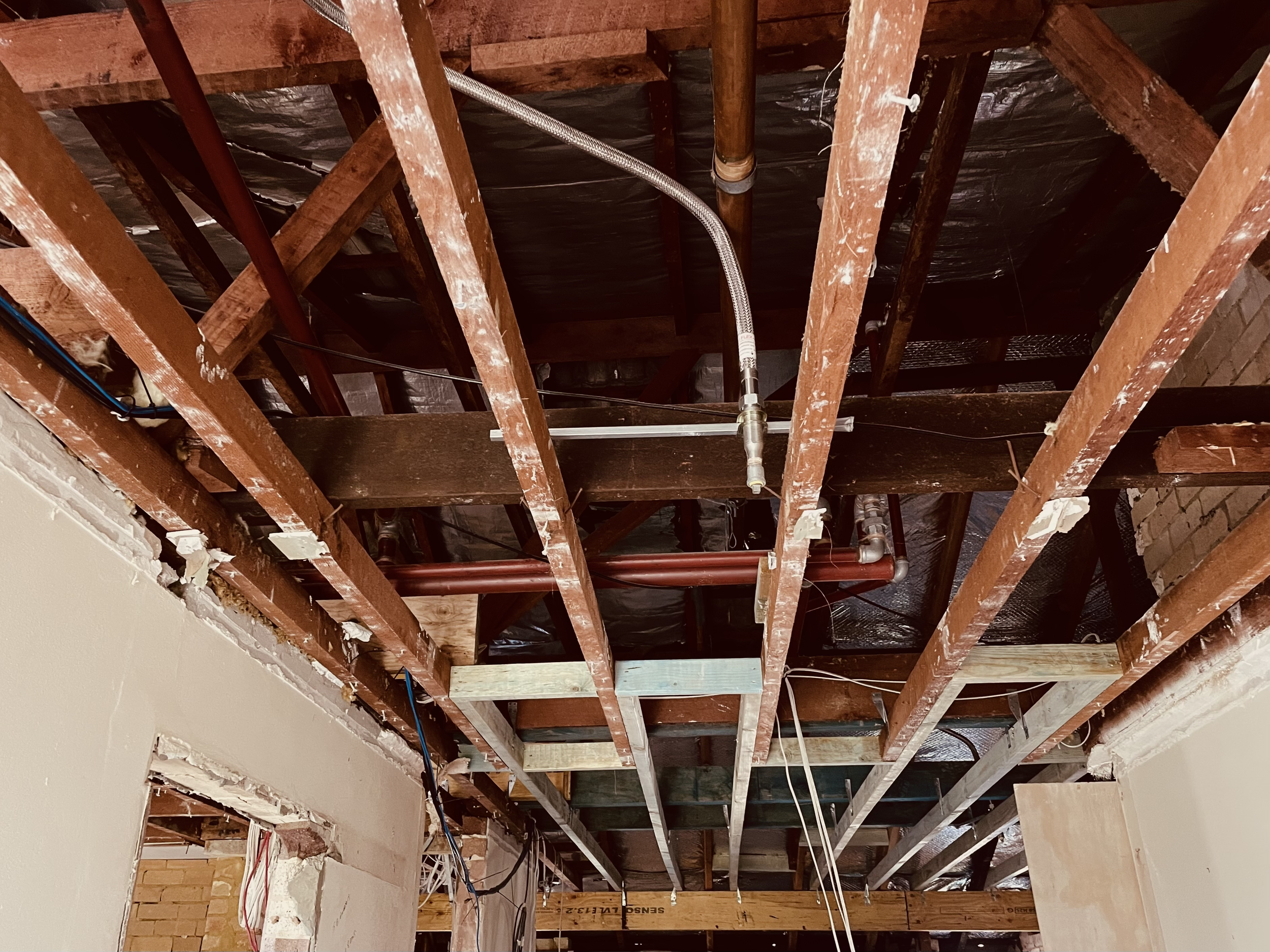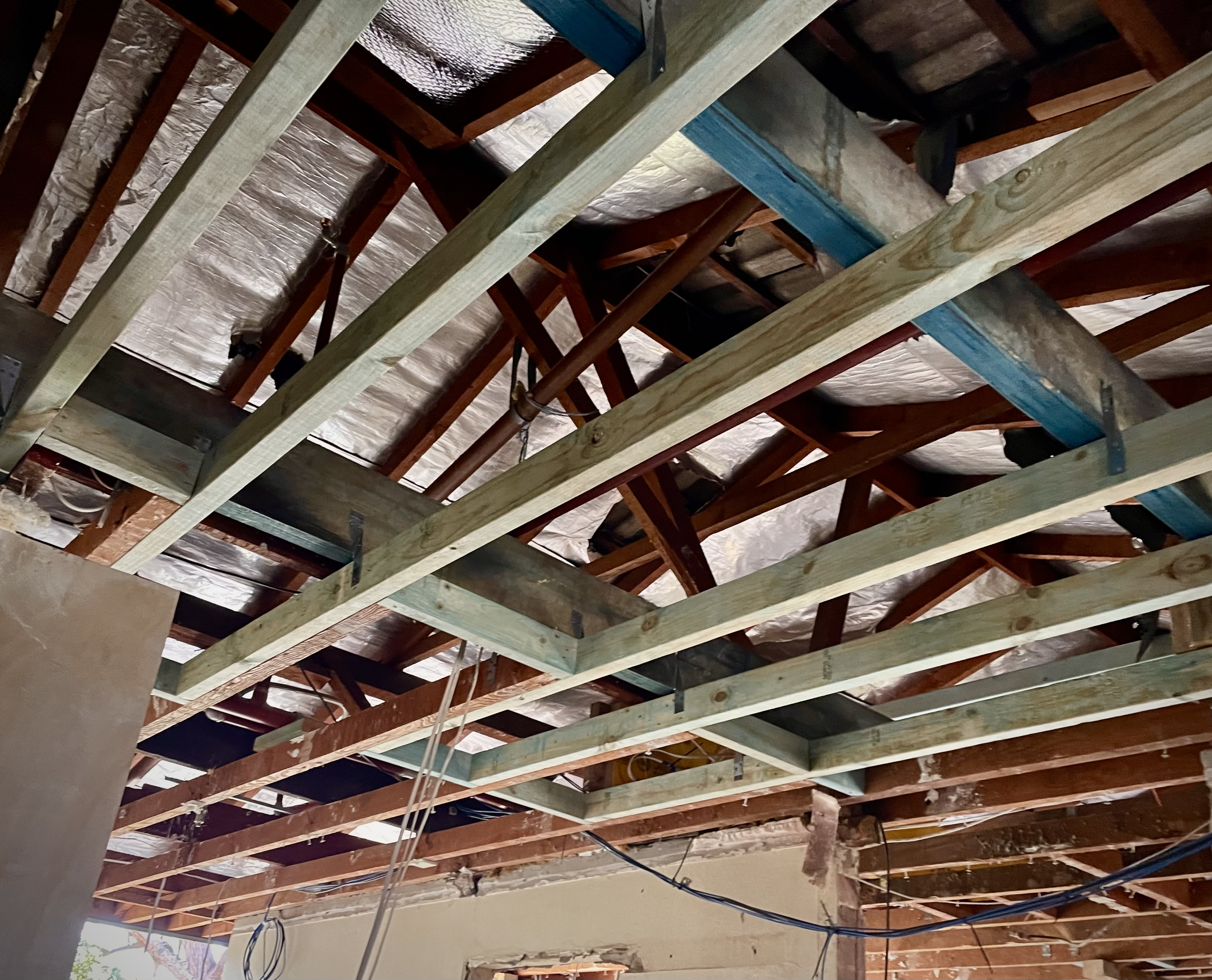 Shot of new ceiling joists and hanging beams to support roof load width in Termite damaged dwelling in Castle Hill.