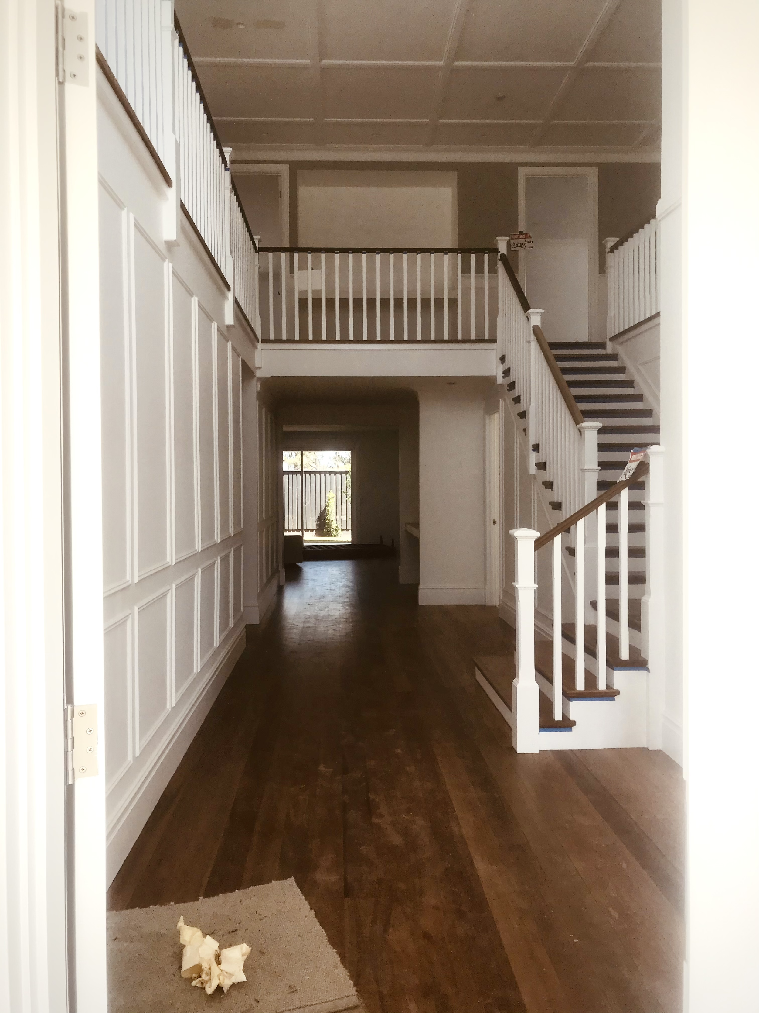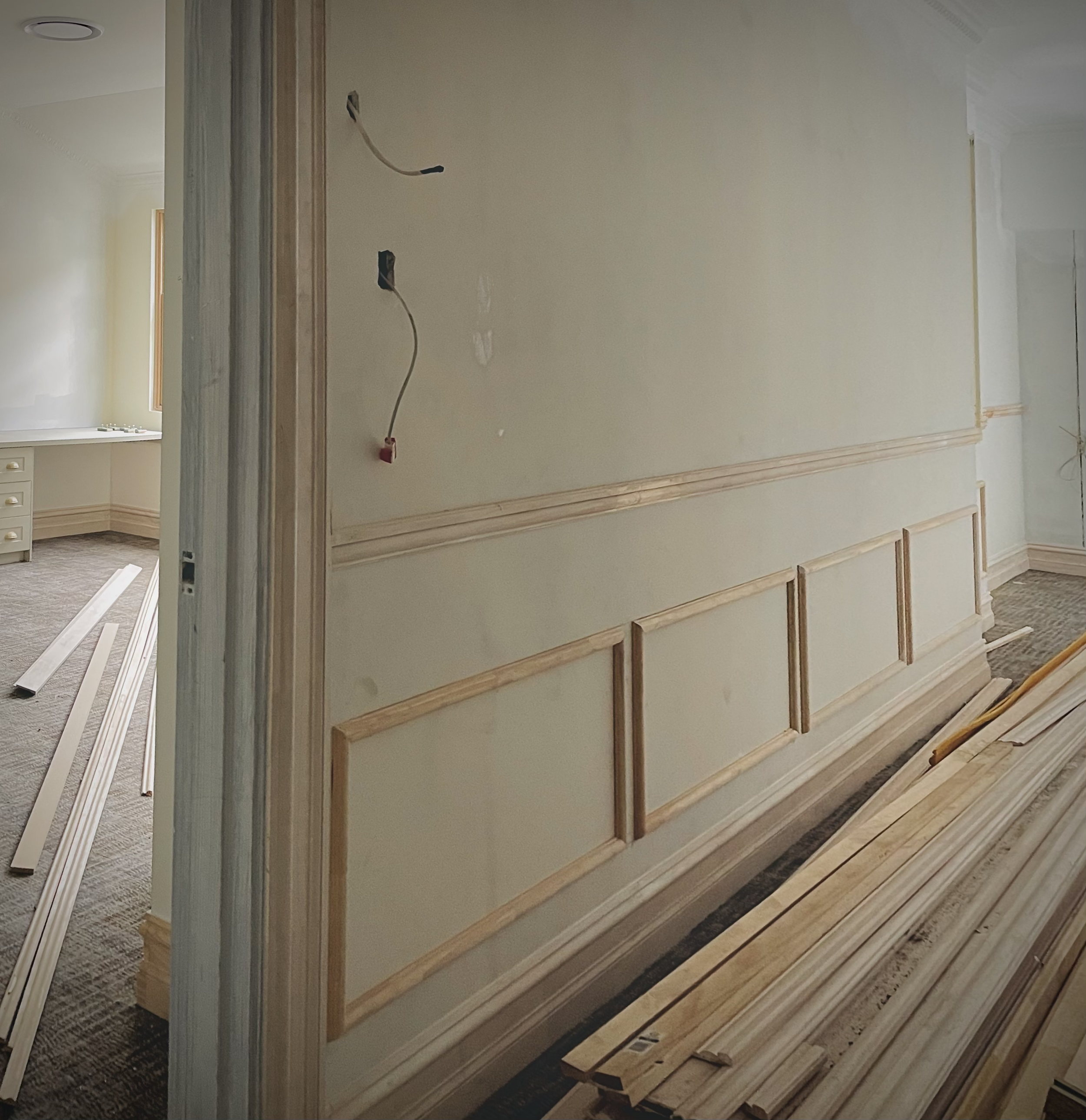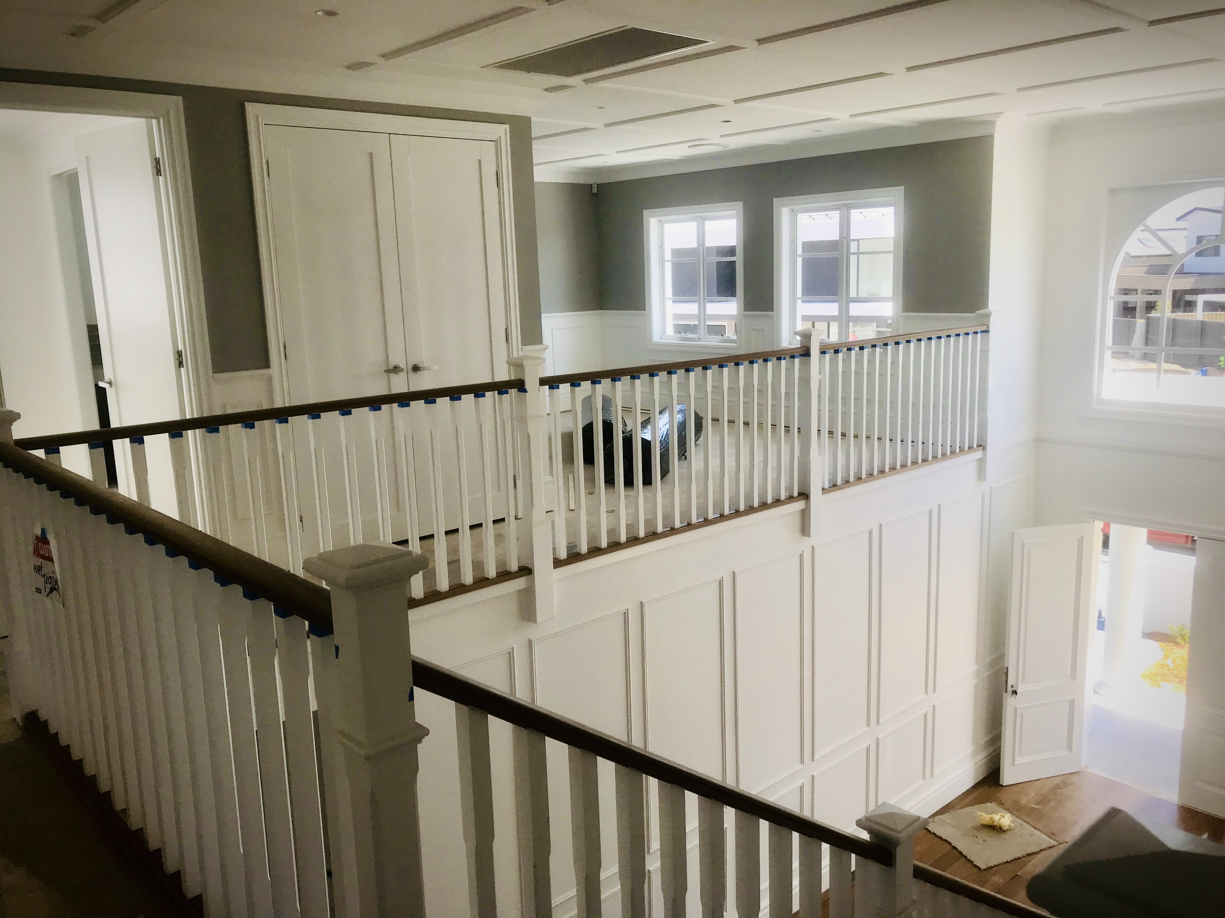 Upstairs shot of new build showing Finish carpentry works such as wainscoting, ceiling paneling, skirting, etc.