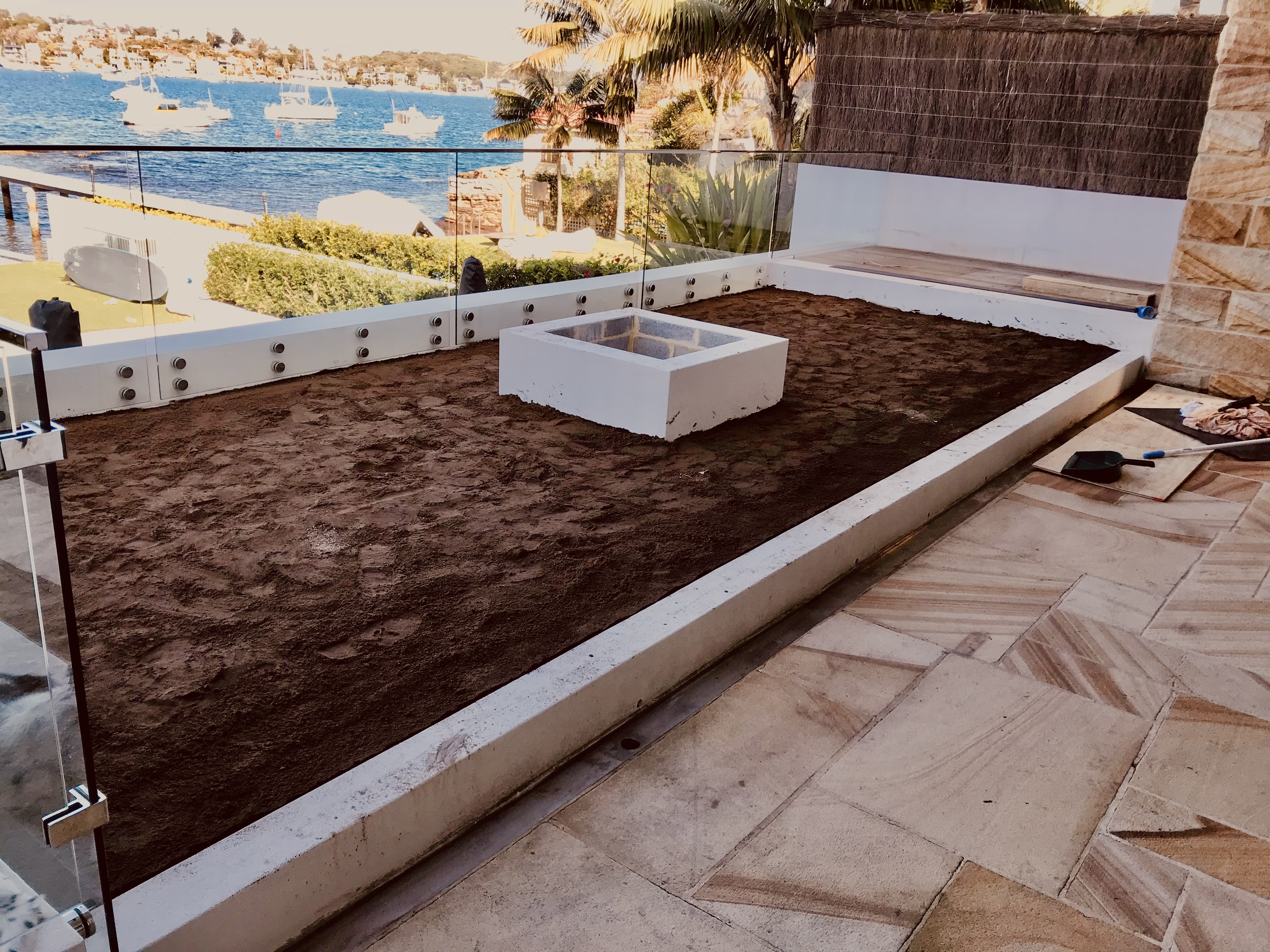 Installation of fire-pit and balcony area for client, complete with turf for the pooch!