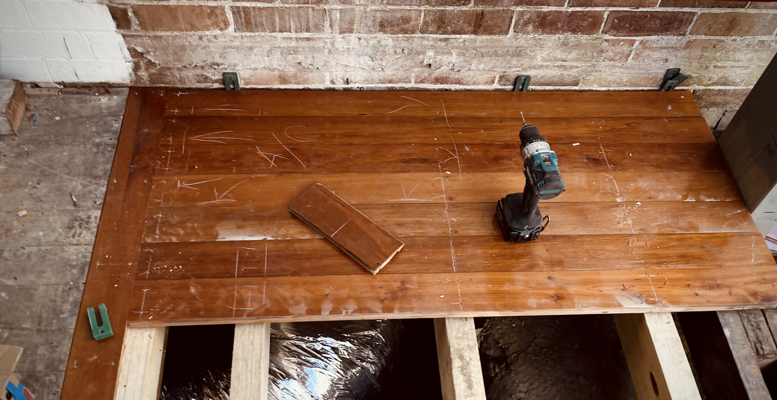 Joist and bearers complete. Laying of reclaimed, period floorboards. Each board was pre-drilled with nails hammered per heritage guidelines.
